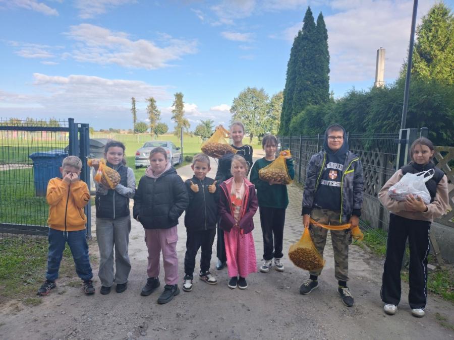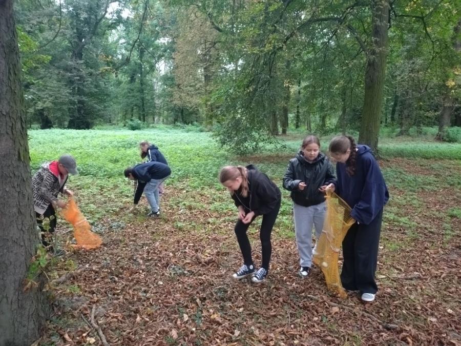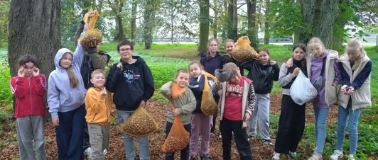 Uczniowie naszej szkoły podczas trzech spotkań wolontariackich zebrali 94 kg kasztanów. Owoce kasztanowca były zbierane w pobliskim parku i oczywiście na ul. Kasztanowej w Kotowiecku. Worki z kasztanami zostały przekazane do Ośrodka Kultury Leśnej w Gołuchowie. Dziki z pokazowej zagrody zwierząt, dzięki naszym uczniom, będą miały smaczny przysmak tej zimy. (U. Adrian)