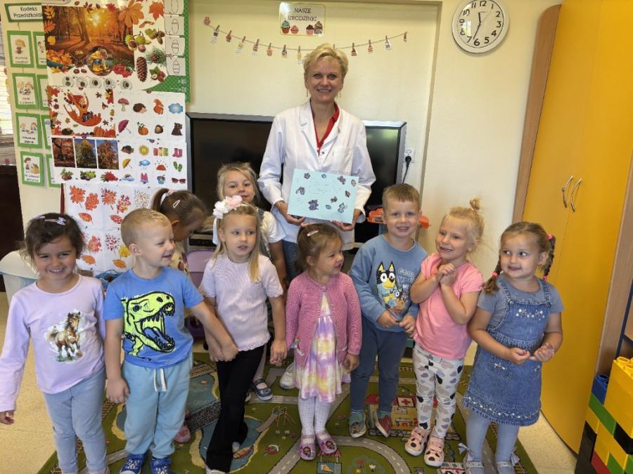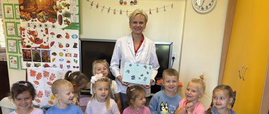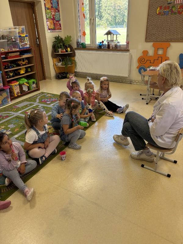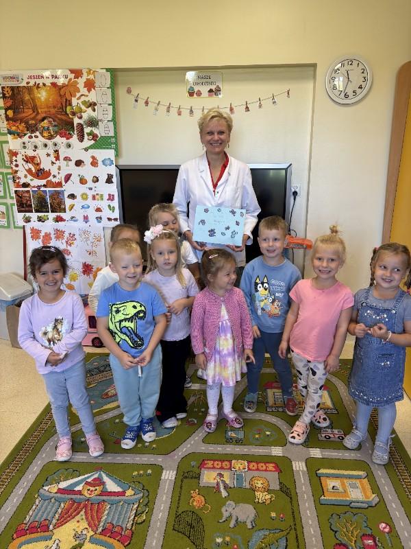 25 września nasze przedszkolaki odwiedziła Pani Pielęgniarka. Celem spotkania było uświadomienie dzieciom konieczności dbania o własne zdrowie. Podczas spotkania przedszkolaki miały okazję dowiedzieć się więcej o trudnym zawodzie pielęgniarki, pokonać lęk przed zabiegami medycznymi, a przede wszystkim wzbogacić i utrwalić swoje wiadomości na temat sposobów dbania o zdrowie. Pani Pielęgniarka przypomniała dzieciom, jak należy ubierać się odpowiednio do pogody, jak właściwie się odżywiać i jak zachować zasady higieny i zdrowego stylu życia. Dzieci, udzielając odpowiedzi na pytania gościa, wykazały się bardzo dużą wiedzą na temat zdrowia i czystości. Na koniec zajęć dzieci umyły zęby szczotkując je bardzo dokładnie przez dwie minuty. Przedszkolaki wręczyły Pani Pielęgniarce laurkę w ramach podziękowania za przekazanie cennych uwag i zrealizowanie miłych zajęć, zrobiliśmy również wspólne zdjęcie. (N. Matyjasik)